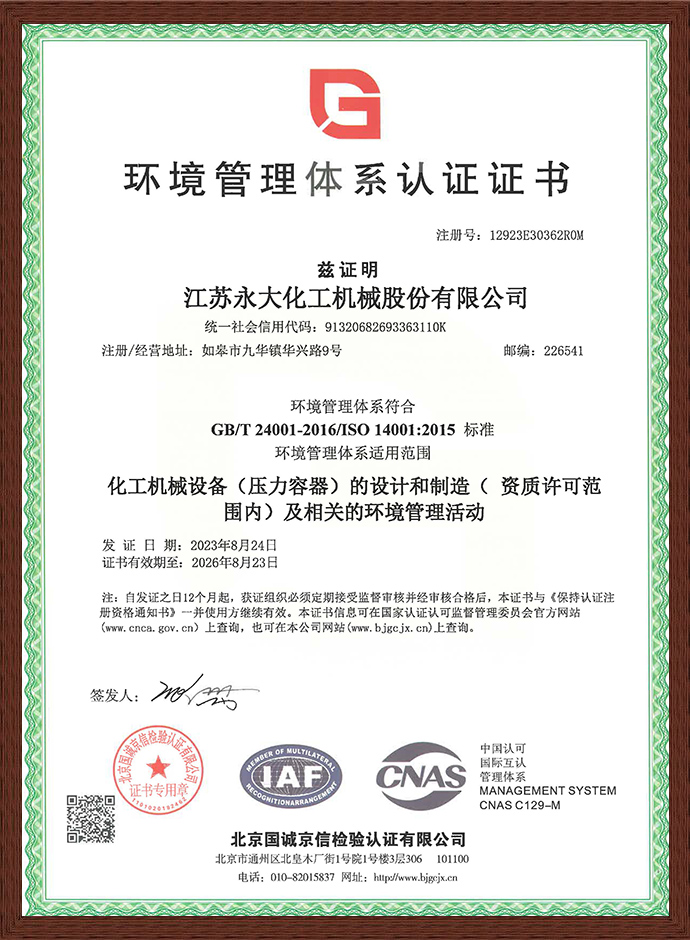 环境管理体系认证证书(中文) - 资质荣誉 - 江苏PA直营化工机械股份有限公司